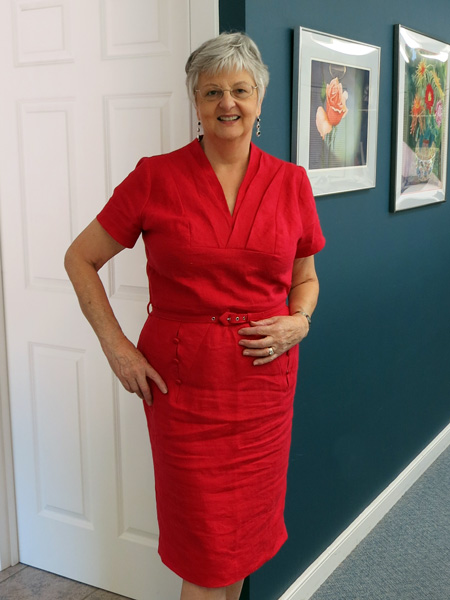 Jane was fortunate enough to see the muslin version of Decades of Styles pattern #5007 Object D'art in the early stages of pattern development .She knew then that she would make it as a classic. The pattern arrived even before it was published and she made it up in a beautiful red linen from Mood in New York. A few changes were made... Jane had a belt made and buttons covered by Pat Mahoney in Lodi CA, and she pegged and shortened the skirt.