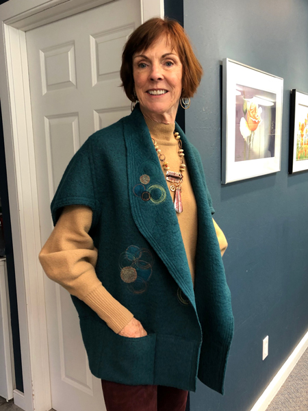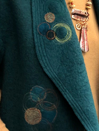 She embellishied it by embroidering the circles in Jane's studio. She used boiled wool and chanel stitched three rows to give it stability. Outstanding.