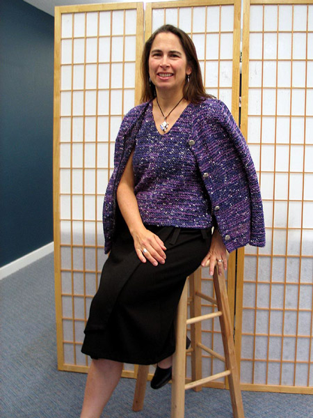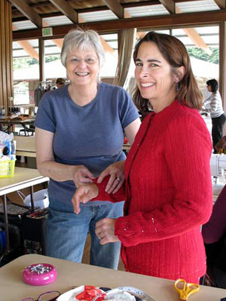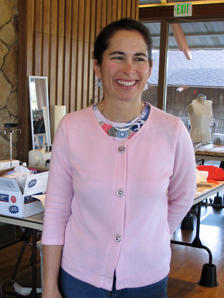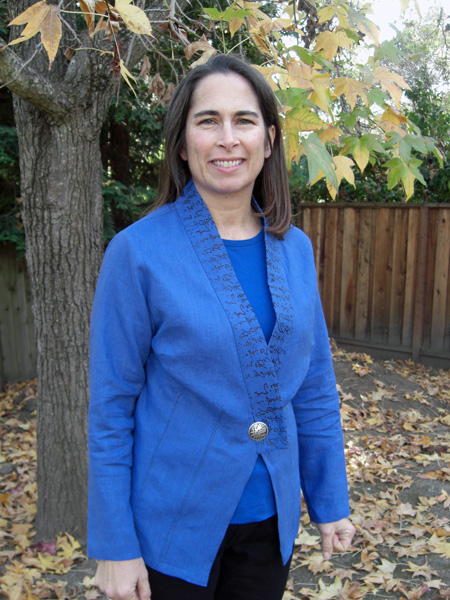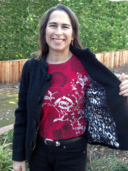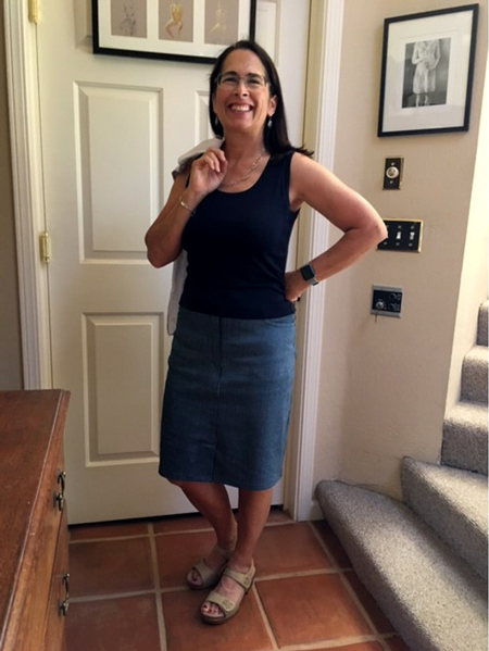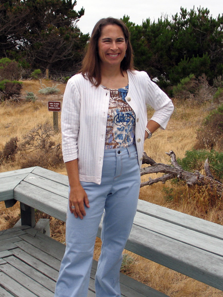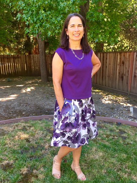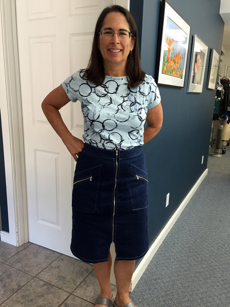 Sally sews with me on Friday mornings. She leads an active life and so likes to make clothes to go with that sporty casual style. Her skill level improves with every garment she makes. You will see that Sally adds an artistic and unique flair to her work, especially with her knit tee shirts. She uses paint and discharge paste to screen designs onto her fabric after she has cut out the pieces and before sewing them together. I am proud to share Sally's creativity with you. StyleArc Skye knit top and Candice skirt