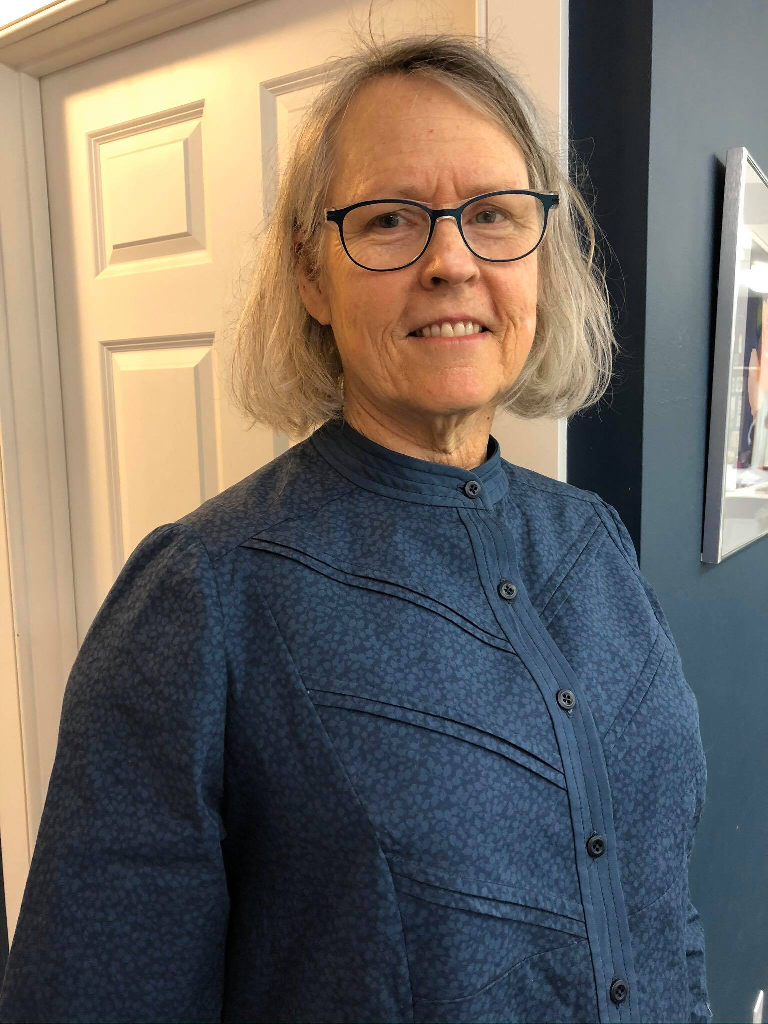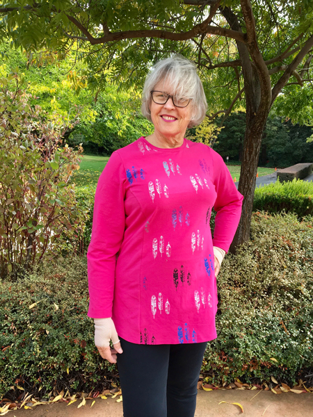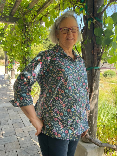 Vicki finished her shirt at Jane's 2022 Sewing Retreat. She used fabric designed by Jane and sold by Spoonflower.