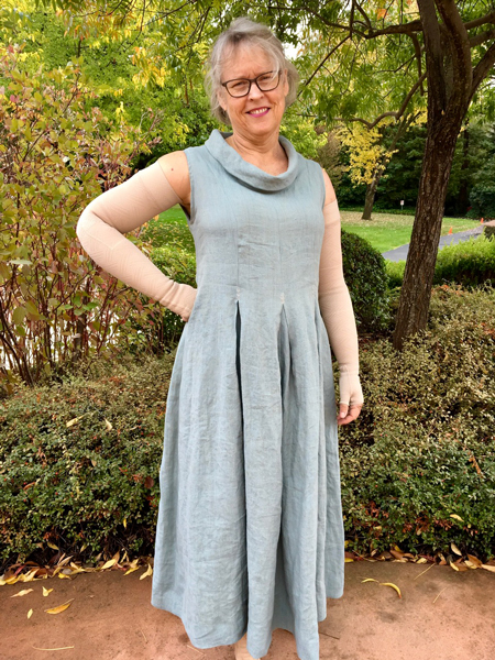 The basis for Vicki's linen dress was Vogue V8509. Jane helped design the cowl collar.