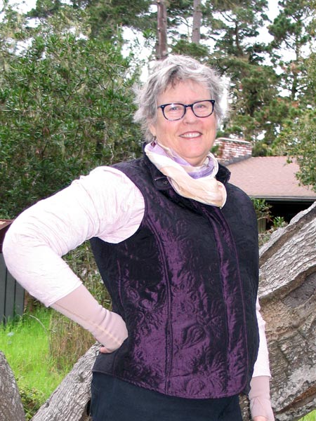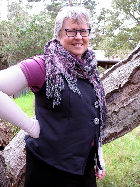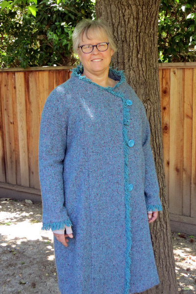Vicki looks so good in this boiled wool jacket. It has beautiful double top stitching on all the edges to give support. It is unlined except for the sleeves. Vicki made a muslin first so she has her altered pattern ready to go on her next jacket.