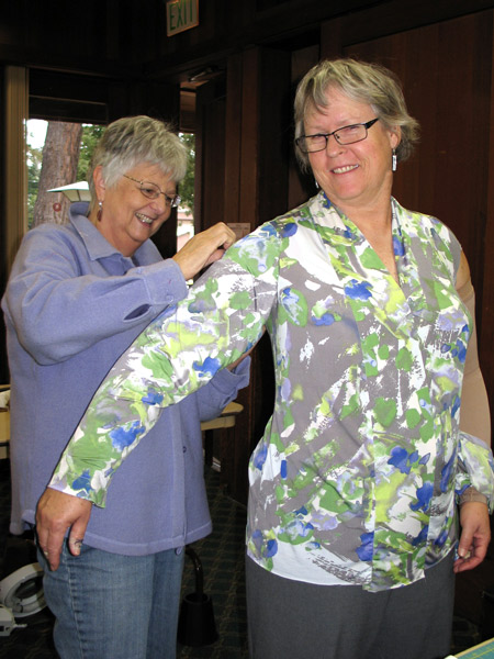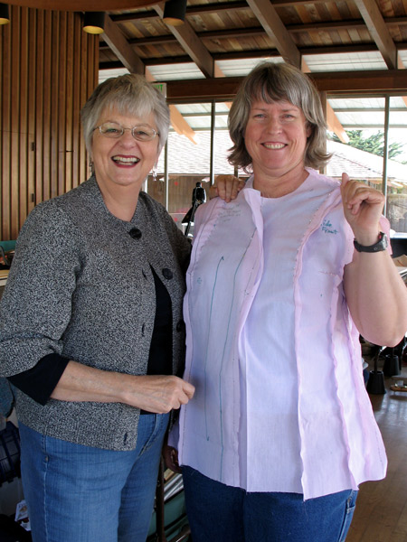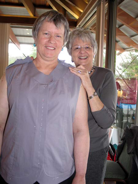 Jane is fitting a tee shirt on Vicki. She used Christine Jonson's pattern 714 V-Neck T. It has a center panel.