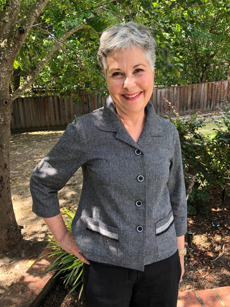 Here is Vicki in a grey linen summer jacket. She and Jane loved the selvedge, so they designed and added two pockets to incorporate it. The pattern is StyleArc Harriet Jacket.
