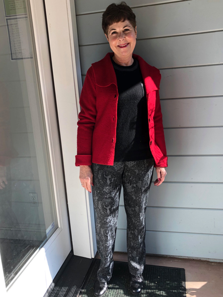 Vicki's made her first pair of printed knit pants. She plans to copy the pattern of this red jacket.