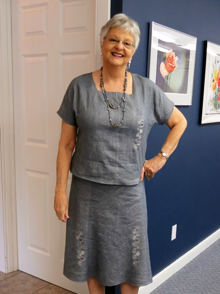 Janice looks cool in this summer shift. We put a few tucks in the knit fabric to give the shift more shape. She used McCalls M6074 pattern. |