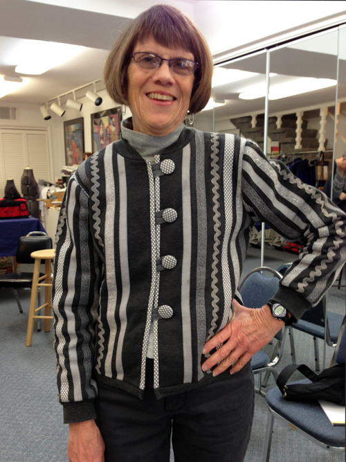 Here is Jeanne in a great knit fabric she found in Europe for this Vogue blouse. |