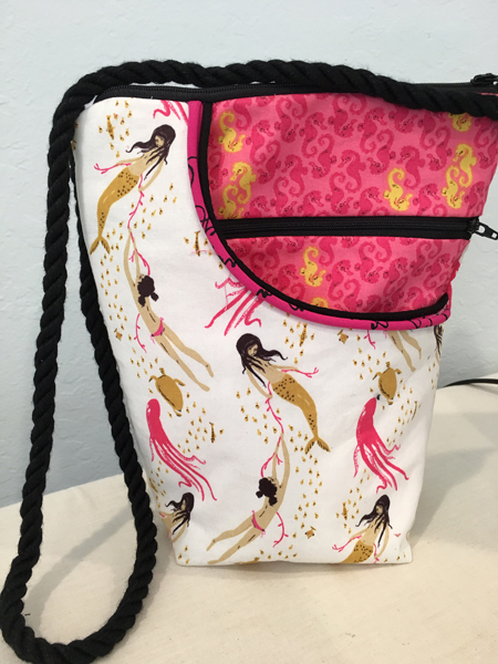Ellen bought this cool cotton in a quilt store in Auburn while she was at the Auburn Sewing Retreat. It is a border print. Ellen used her own pattern and made pockets out of woven strips of the fabric. |