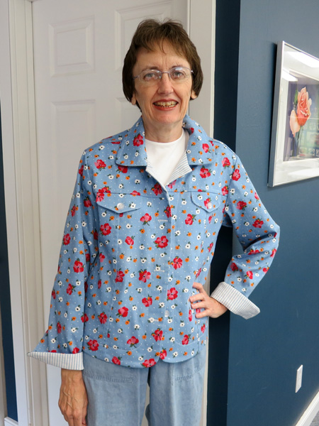 Susan made this cotton printed casual summer jacket and used a striped fabric as a trim. |
